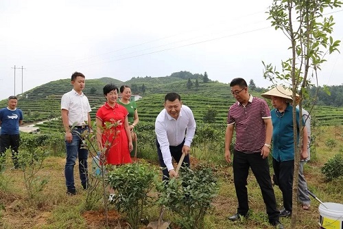 孔祥柱与丹寨县委常委宣传部长彭瑶及参会企业家们,在丹寨扶贫茶园亲手种下了扶贫茶树,祝愿今日种下的这颗小树苗未来在丹寨的沃土上能茁壮成长,扶贫茶园、丹寨和贵州经济一起腾飞。